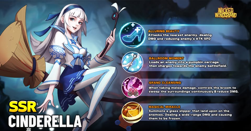 Cinderella--A Hero with hug range damage. When facing enemies, She will use her glass slipper to smash them all. She swear that she will sweep all of the obstacles on your path to throne.